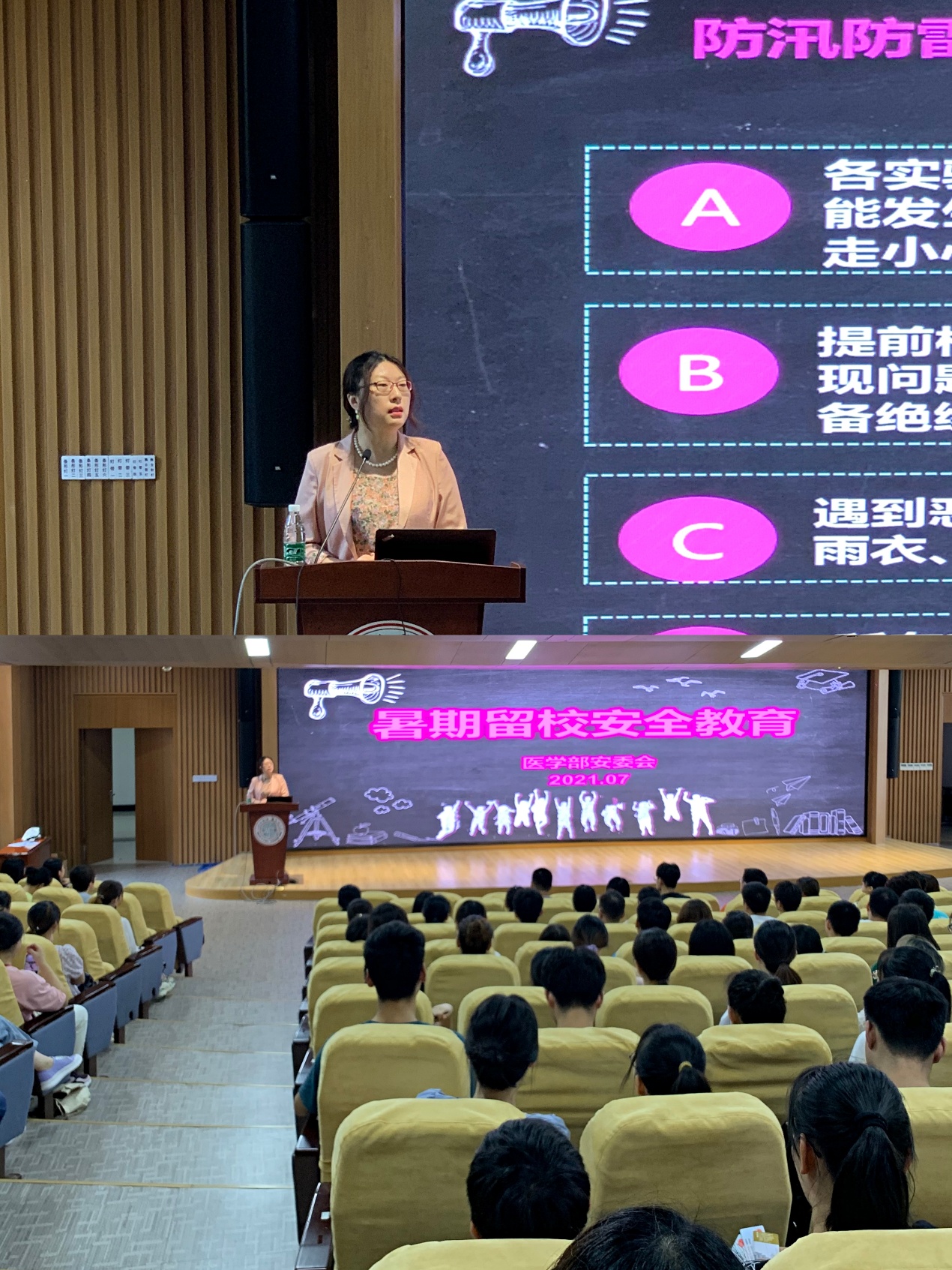 为进一步增强暑期留校研究生及实验人员安全防范意识,保证师生员工人身安全、学校公共财产安全及实验室安全,7月7日上午,学院邀请医学部实验中心蒋芸老师作安全专项培训。学院兼职安全员、研究生辅导员以及200余名研究生和实验人员参加了培训。培训会由副院长杨雪珍主持。
