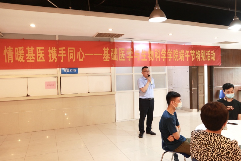 我院在研究生日常管理中坚持以人为本,注重人文关怀,时刻关注学生的科研进展和身心健康。自4月23日第一批学生返校后,学院先后开展了数次学生座谈会,全面了解学生返校后在学习、生活等方面的需求。在帮助学生解决实际困难的同时,也希望通过举办一些主题活动丰富课余生活,从而积极引导学生能够正确认识目前面对的困难和挑战,并帮助大家树立积极乐观的生活态度。恰逢端午佳节之际,学院组织以“情暖基医,携手同心”为主题的端午节系列活动,于6月22至24日分三批次在独墅湖教工食堂二楼开展,希望通过此次活动能让大家度过一个难忘又有意义的端午节。同时,随着毕业季的到来,学院也将借此活动送别毕业生们,愿母校能够给同学们留下更加美好的回忆,为了祖国的发展拼搏奋斗,书写新时代的人生华章。参加本次活动的有研究生工作部部长吴雪梅,研究生管理办公室主任赵一强,医学部党工委副书记吴德建,学院院长吴嘉炜,党委书记沈学伍,副院长张洪涛、陶金、杨雪珍以及学院系主任、支部书记、研究生辅导员和全院研究生,此次活动由研究生会主席朱磊和干事叶文涛主持。