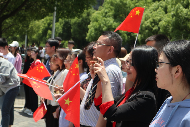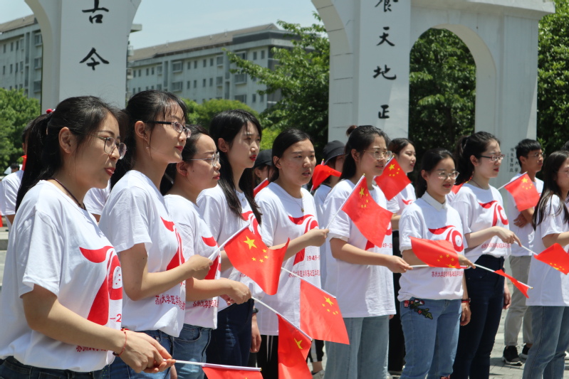 在镌刻着“养天地正气,法古今完人”的东吴大学门楼旧址之下,激昂的曲调、曼妙的舞蹈、热情的歌声,闪现着青春的活力,吸引众多来往同学驻足观看。东吴大学旧址门楼上五星红旗随风飘扬,歌唱祖国的歌声多么响亮……