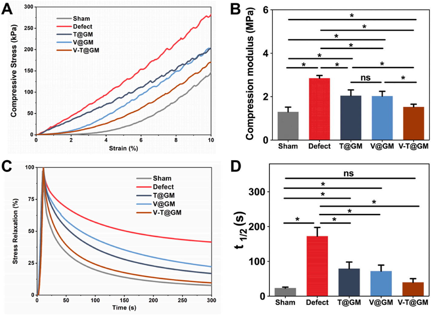 在大鼠IVDD模型中,vanillin功能化递送系统有效清除损伤局部过量的H2O2,维持损伤节段的椎间高度和髓核含水量(图7),恢复椎间盘组织完整结构以及正常生物力学功能(图8,9)。