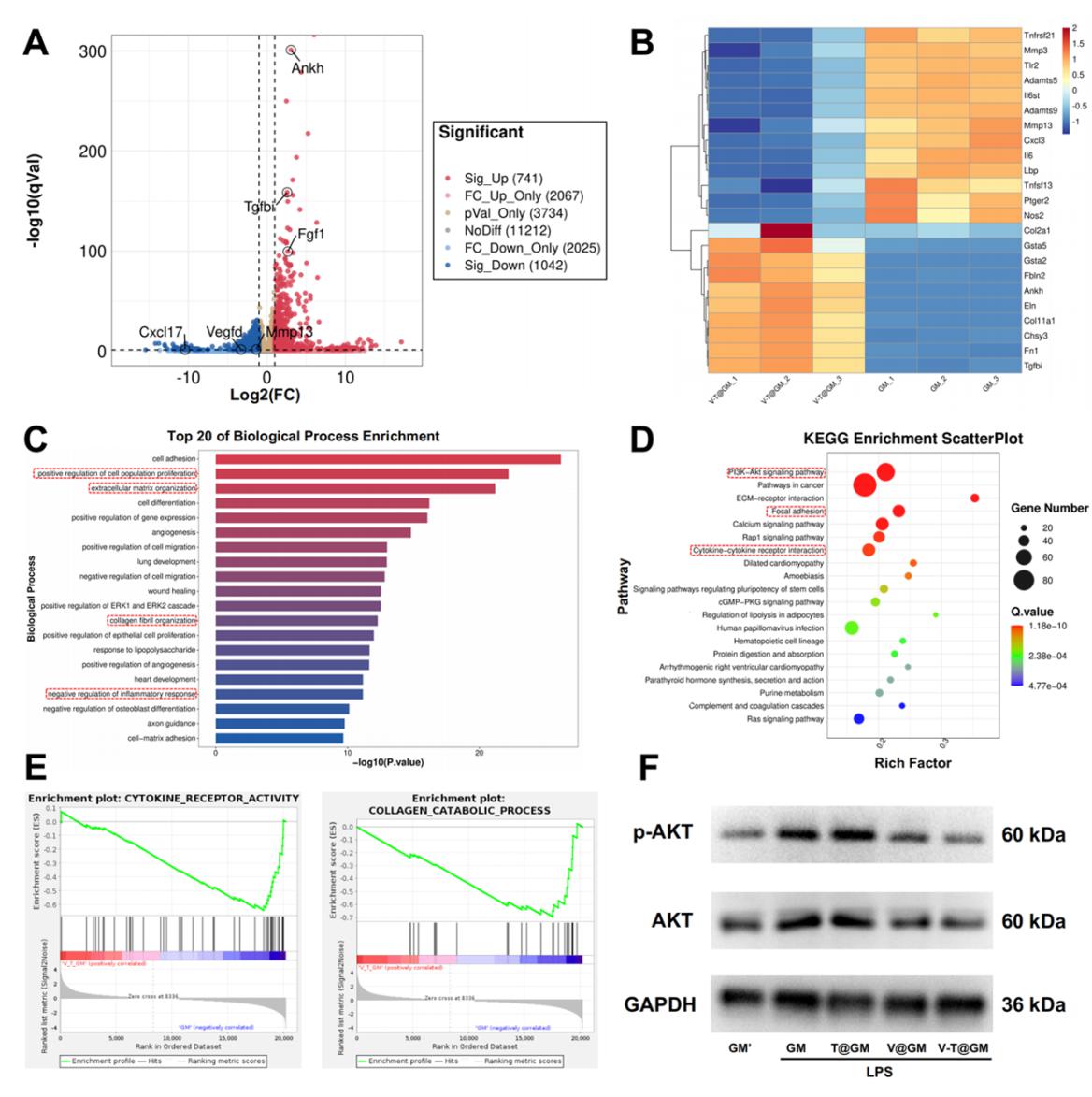 进一步对发挥治疗作用的机制进行研究发现,vanillin功能化递送系统可避免炎症微环境引起的PI3K-Akt信号的异常激活,抑制包括“细胞因子受体激活”、“胶原降解”和“细胞衰老”等不良过程,从而有效干预IVDD的起始与进展(图6)。