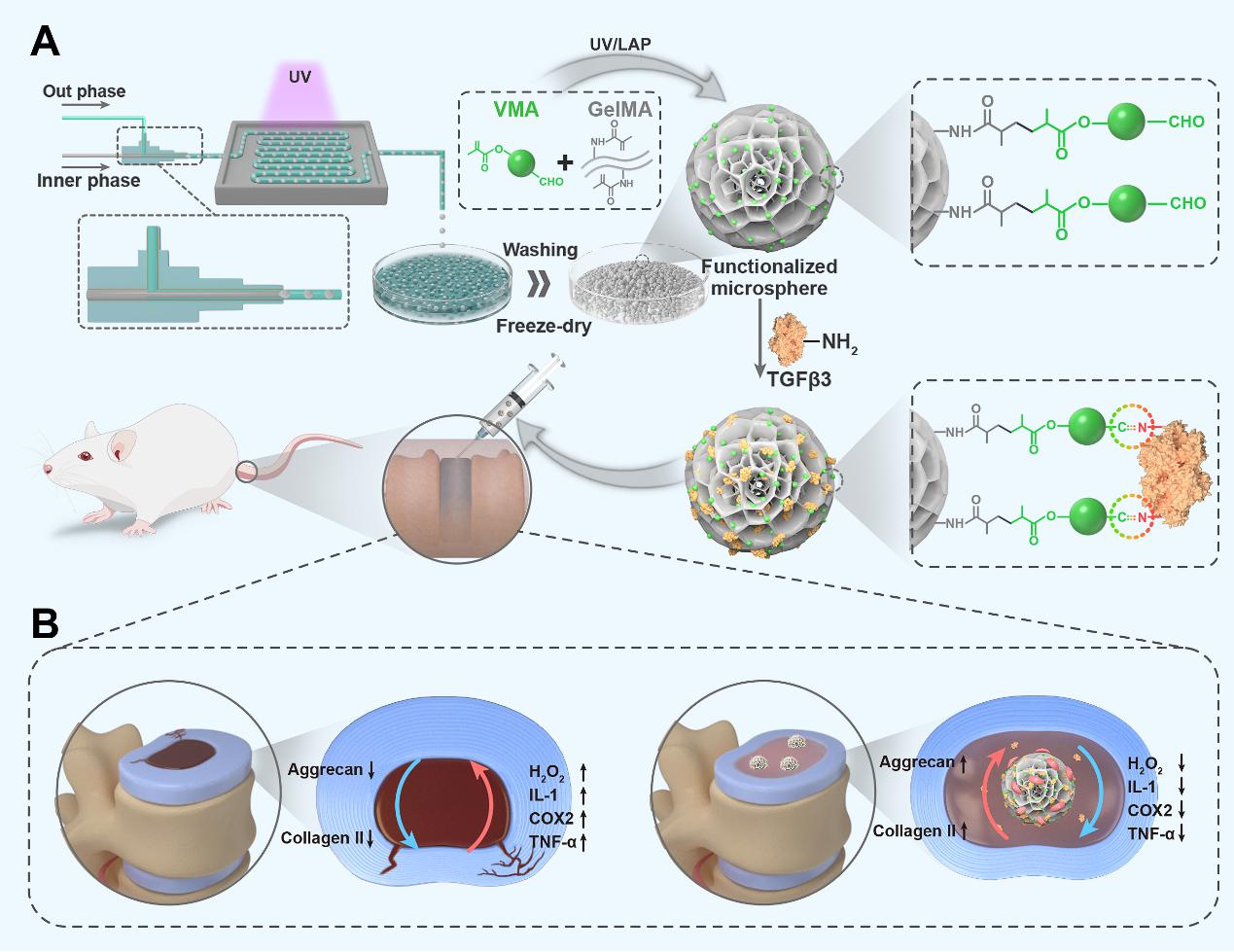 综上所述,本研究提出了一种基于vanillin的功能化策略,用于构建多功能微球递送平台,为将多种功能富集到单一递送平台提供了一种新颖而简单的方法,同时有望促进包括椎间盘在内的组织修复与再生。
