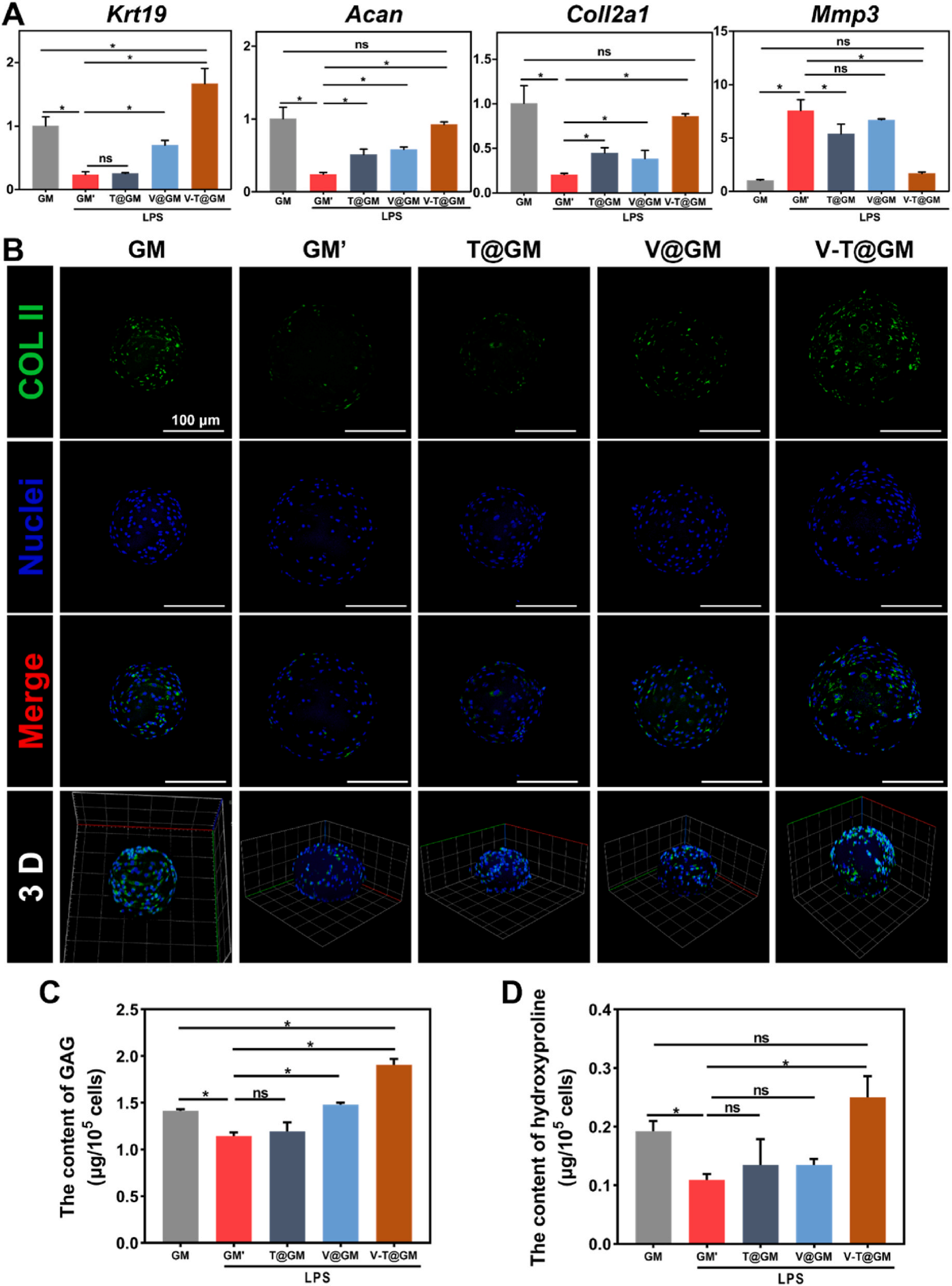 该功能化微球能够有效抑制脂多糖(Lipopolysaccharide,LPS)诱导的NPC中炎症反应的过度激活(图4),并协同TGFβ3在炎症微环境中有效维持NPC细胞表型、促进ECM的合成并抑制降解,从而恢复ECM合成/分解代谢的失衡,促进ECM的分泌与累积(图5)。