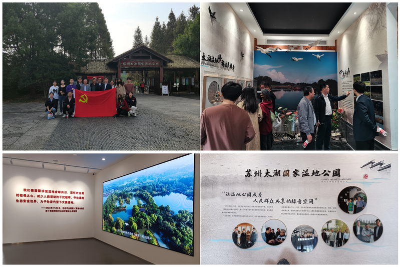 在苏州太湖湿地科普馆,大家一起学习了习近平总书记在《湿地公约》第十四届缔约方大会开幕式上所发表的《珍爱湿地,守护未来,推进湿地保护全球行动》致辞:“我们要凝聚珍爱湿地全球共识,深怀对自然的敬畏之心,减少人类活动的干扰破坏,守住湿地生态安全边界,为子孙后代留下大美湿地。”该科普馆位于世博苏州新馆内,以“生态、和谐”为基本元素,展示太湖流域原生态美景,历史积淀文化,以及环境与人和谐发展。