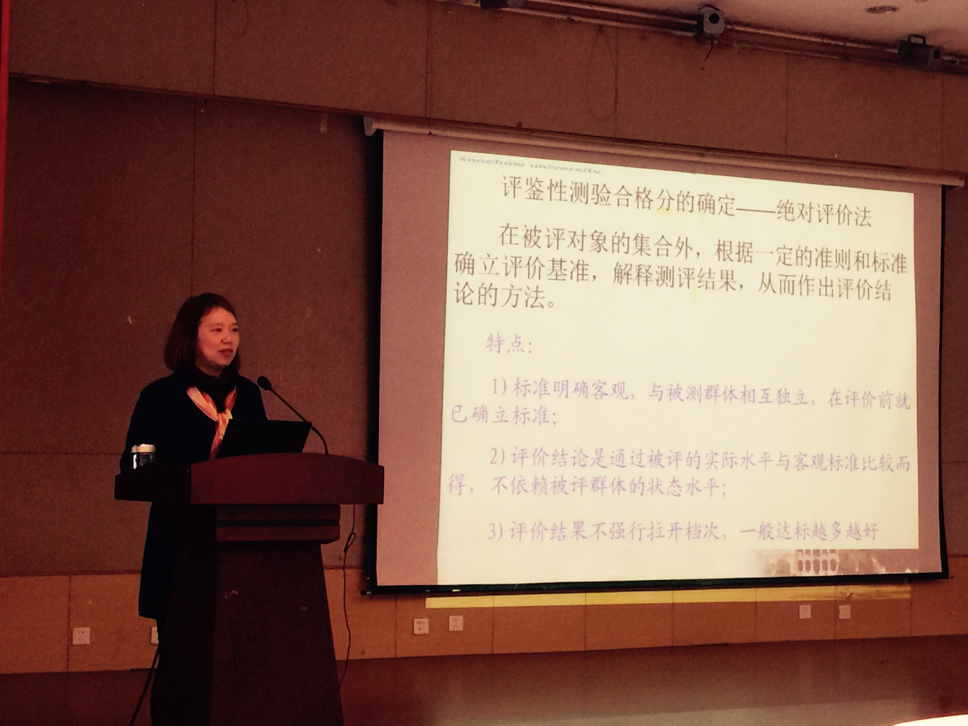 王伟群教授从教育统计学的专业角度,详细地阐述了教育测量、科学命题和合理评价的定义与方法。教育测量即对学生的学习能力、学业成绩、兴趣爱好、思想品德以及教育措施上许多问题进行客观地量化测定。王老师围绕规范命题过程的各个环节,从考试目的的确定、考试双向细目表的编制,到编题、审题、组卷到最后审卷等进行了详细的说明,其间对考核的类型、认知水平与考核要求等作了详细的介绍,在讲解过程中王老师不仅有理论的讲解还结合医学教学特点和全国执业医师资格考试进行了针对性的分析。还对试卷进行合理的难度、信度、效度分析是达到全面客观评价的科学方法作了说明。通过这次活动,学院希望全体老师能够科学、合理、规范地组织各类考试,发挥课程考核应有的作用,诚如王伟群教授报告结尾所言:应试教育固不可取,科学测量与合理评价是教学的重要是有段,也是促进学生学习和进步的法宝之一。对于学业繁重、考试标准严格的医学学子来说尤其如此。通过”科学命题、合理评价”讲座的学习,相信在座的教师们受益良多,会在今后的各类考试中更好地运用相关理论知识与经验、达到客观评价学生的知识能力水平和培养合格专业人才的目的,促进我院的教育水平更上一个新的台阶。