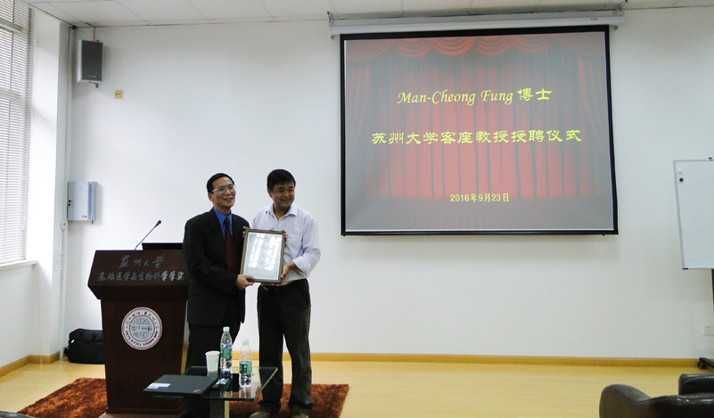高晓明首先对Fung教授的成就进行了简要介绍。Mann Fung教授现任Johnson&Johnson公司研发中心全球副总裁,加拿大温哥华Virogin溶瘤病毒有限责任公司科学顾问委员会委员。Fung教授在肿瘤生物学领域有长期的积累,是肿瘤生物治疗领域的国际知名专家。在一片热烈掌声中,高晓明代表学校为Fung教授颁发了客座教授聘书,并佩戴校徽。Fung教授表示很荣幸成为苏州大学的一员,并期待今后与我院相关学科开展更多的交流与合作。
