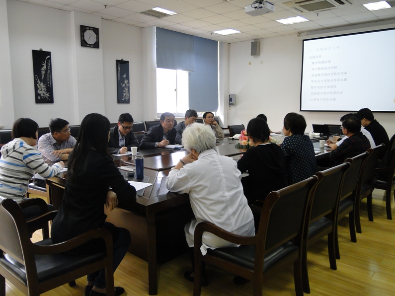 作为期中教学检查常规内容的教师座谈会是检查本学期教学工作的一项重要内容,今年的期中检查学校又赋予了对省教育厅本科教学工作审核评估准备情况的检查,学院非常重视,于2017年5月3日分别召开了医学、生物相关专业的教学座谈会。医学部副主任龚政、教学办公室主任钟慧和副主任倪建国、医学部实验中心主任陈乳胤都莅临参会。我院各系教学主任和教师代表二十余人出席了座谈会,座谈会由学院戈志强副院长主持。 戈志强就此次座谈会围绕的内容进行了简单介绍,要求各系围绕期中教学听课安排、教研活动安排、实验教学情况、毕业论文指导情况、下学期教学任务落实情况、期中考试安排情况及存在的问题等进行了交流讨论,并对审核评估的准备情况提出要求。