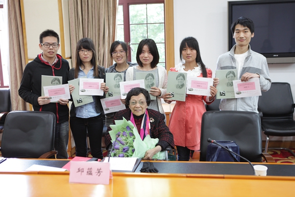 热烈掌声中,邱蕴芳为我院首批获助的6名学生颁发助学金并合影。