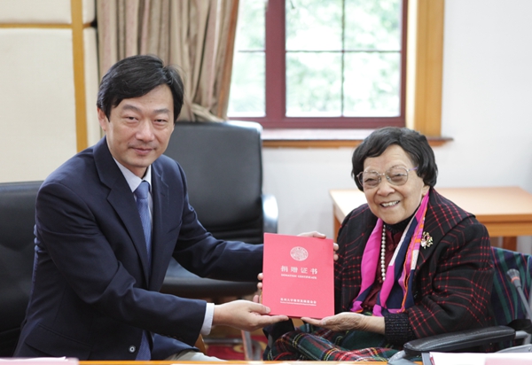 随后,邱蕴芳向学校捐赠谈家桢邱蕴芳奖助基金,田晓明为邱蕴芳颁发捐赠证书。