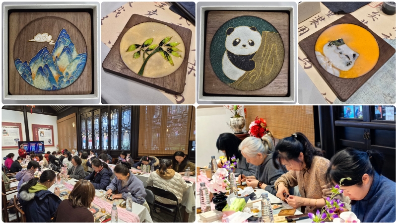 活动当天,大家结伴步行前往平江文化中心,沿途感受平江路小桥流水、古巷幽深的江南韵味。13:30非遗掐丝珐琅手作体验正式开启。在非遗制作老师的专业指导下,大家沉浸式感受传统工艺的精妙与雅致。从描图、掐丝、点蓝、固色,每一步都需要耐心与专注。一根根纤细的铜丝在指尖弯折、勾勒,化作细腻流畅的纹样;色彩丰富的釉料层层点染、均匀铺陈,让作品渐显温润光泽与艺术质感。大家凝神创作、互相交流,在一掐一填、一点一染中感受非遗之美,一件件精致典雅、独具匠心的掐丝珐琅作品陆续诞生,既承载着非遗文化底蕴,也彰显了女教职工的巧思与才情。