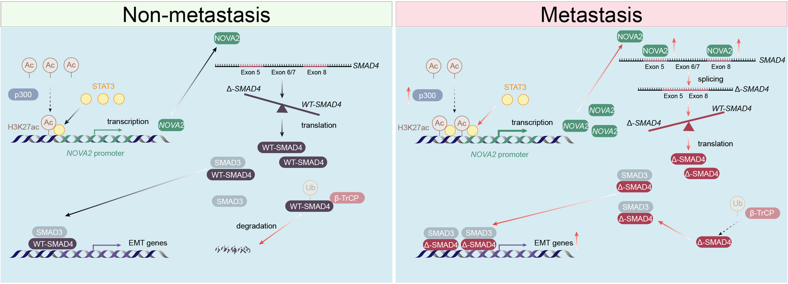 该团队通过整合生物信息学分析与临床大样本数据,鉴定出在转移性肺腺癌中显著高表达的RNA结合蛋白NOVA2。研究发现,NOVA2的表达水平与肺腺癌患者的不良预后及淋巴结转移密切相关,敲低NOVA2能够抑制肺腺癌细胞的上皮-间质转化(EMT)和侵袭转移。机制上,组蛋白乙酰转移酶p300介导的H3K27乙酰化修饰增强,促进转录因子STAT3与NOVA2启动子区结合和后者的转录激活;上调的NOVA2进而通过调控SMAD4基因的可变剪接,诱导产生一种缺失第6、7号外显子的截短型异构体Δ-SMAD4。该异构体因逃避E3泛素连接酶β-TrCP介导的泛素化降解而更加稳定,从而持续激活TGF-β/SMAD信号通路,最终驱动肺腺癌细胞EMT和转移。
