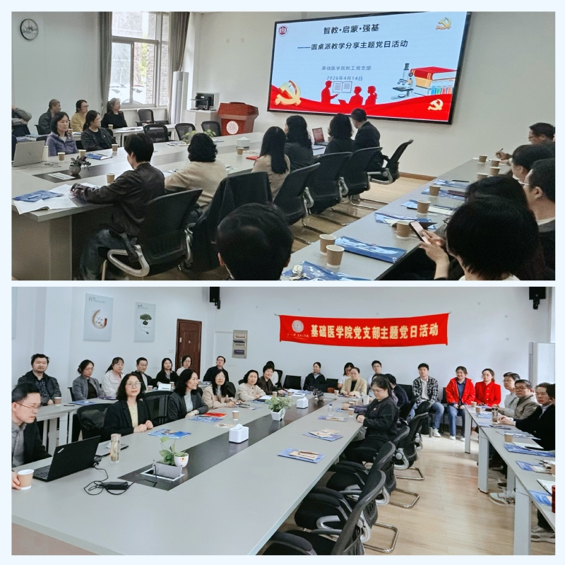 为深入贯彻新时代党的教育方针,落实立德树人根本任务,推动党建工作与医学教育教学深度融合,4月14日下午,基础医学院教工第二、第三党支部联合开展“智教•启蒙•强基”教学圆桌派主题党日活动。活动由学院副院长朱一蓓教授主持,各党支部党员教师、骨干教师代表齐聚一堂,共话教学改革与人才培养。